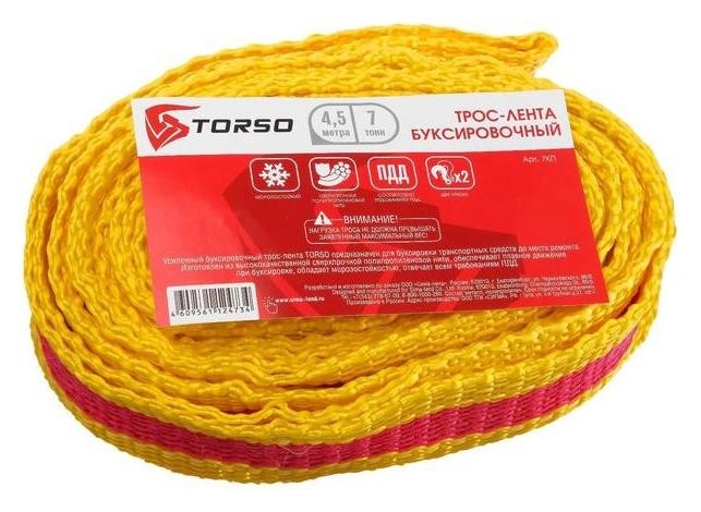 Усиленный буксировочный трос-лента TORSO предназначен для буксировки транспортных средств до места ремонта. Трос изготовлен из высококачественной сверхпрочной полипропиленовой нити, обеспечивает плавное движение при буксировке, простую и надёжную сцепку при помощи стальных крюков, обладает морозостойкостью, также отвечает всем требованиям ПДД. Заявленные характеристики подтверждены заводскими испытаниями.