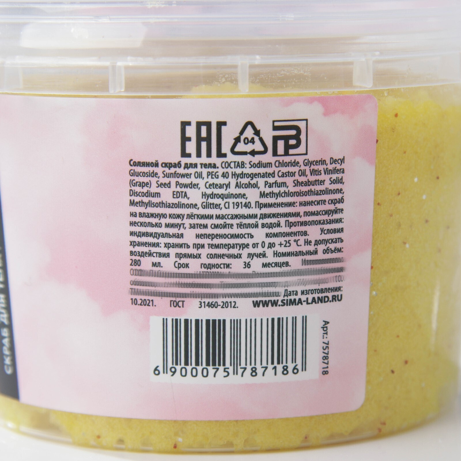 СОСТАВ: Sodium Chloride, Glycerin, Decyl Glucoside, Sunfower Oil, PEG 40 Hydrogenated Castor Oil, Vitis Vinifera (Grape) Seed Powder, Cetearyl Alcohol, Parfum, Sheabutter Solid, Discodium EDTA, Hydroquinone, Methylchloroisothiazolinone, Methylisothiazolinone, Glitter, CI 14720.