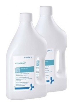 Дезинфицирующее средство ?Ротасепт? 2 л (готовый раствор). Химический состав дезсредства: спирты, поверхностно-активные вещества (ПАВ), вспомогательные компоненты. Действующие вещества: изопропиловый спирт (пропанол-2) 10 %, вспомогательные компоненты , ПАВы. Сфера применения: ЛПУ. Объекты обработки: вращающиеся стоматологические инструменты. Класс опасности: при введении в желудок - 4; при нанесении на кожу - 4; рабочего раствора - 4. Активно в отношении: - бактерии (Mycobacterium tuberculosi, грамотрицательные бактерии, грамположительные бактерии); - вирусы (ВИЧ, гепатита В, грипп, прочие возбудители ОРВИ); - патогенные грибы (кандида). Срок годности: в упаковке - 3 года, в рабочем растворе - 1 день. Страна производства: Германия.