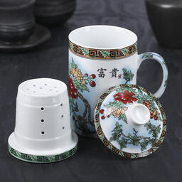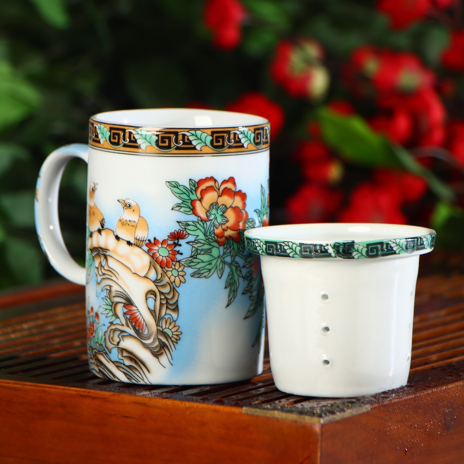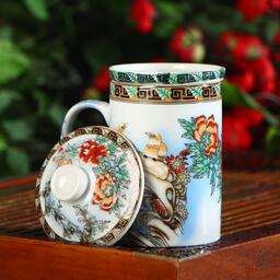 Кружка «Птицы в пионах», 300 мл, с крышкой и керамическим ситом