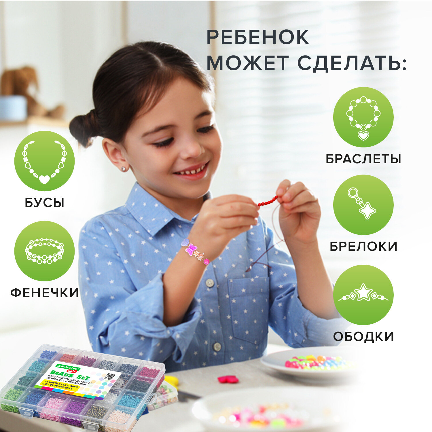 664696, Набор BEADS SET для творчества, рукоделия и создания украшений из бисера, 6000 бусин, 24 вида, нить, BRAUBERG KIDS, 664696