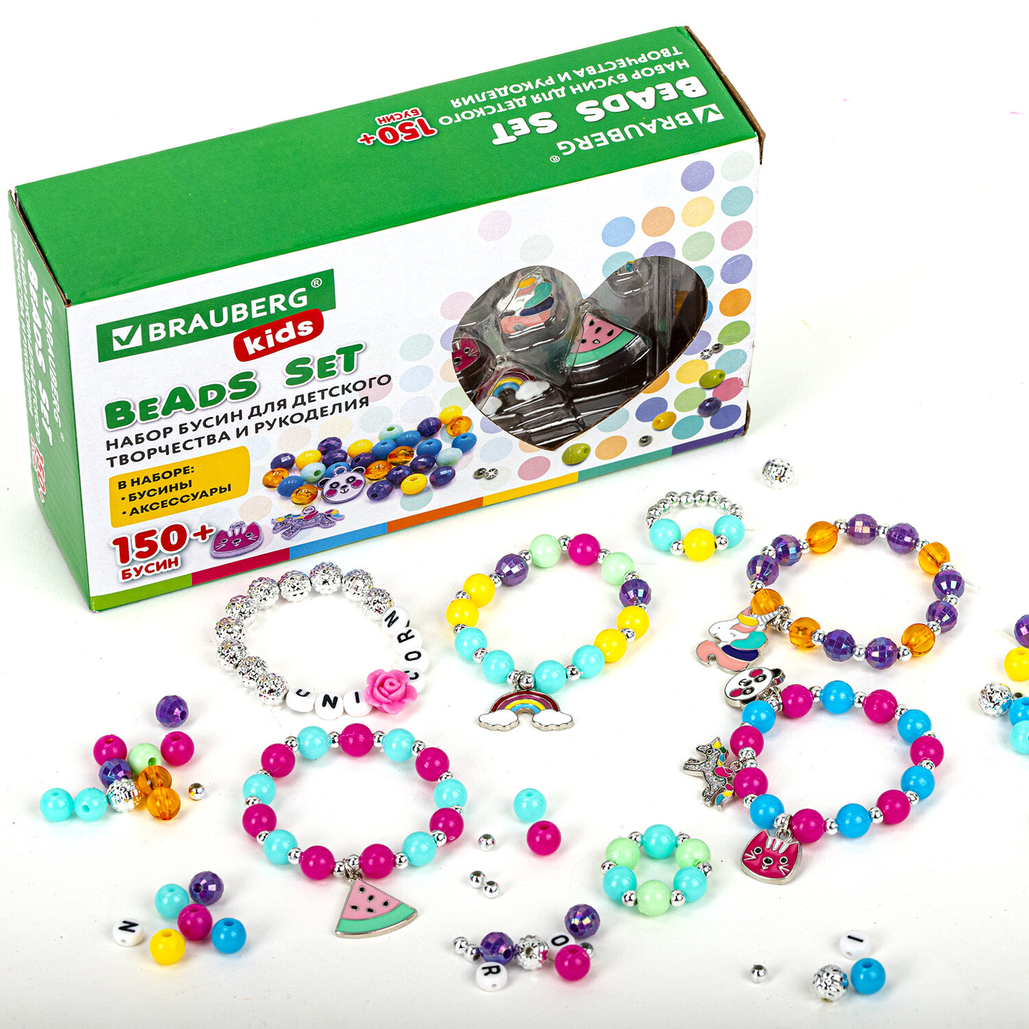664699, Набор BEADS SET для творчества, рукоделия, и создания украшений ЕДИНОРОГИ, 150 бусин, 6 металлических шармов, резинка, BRAUBERG KIDS, 664699