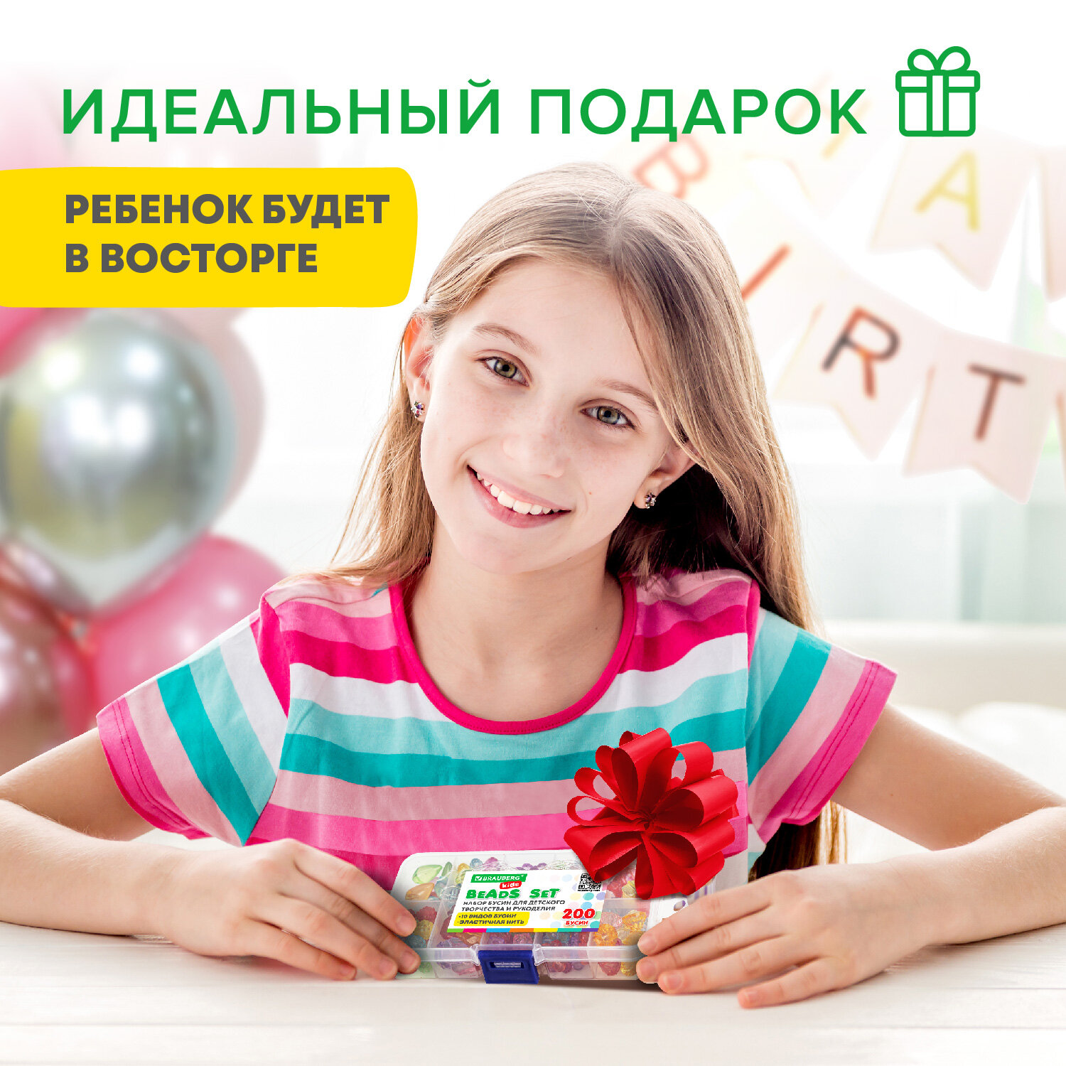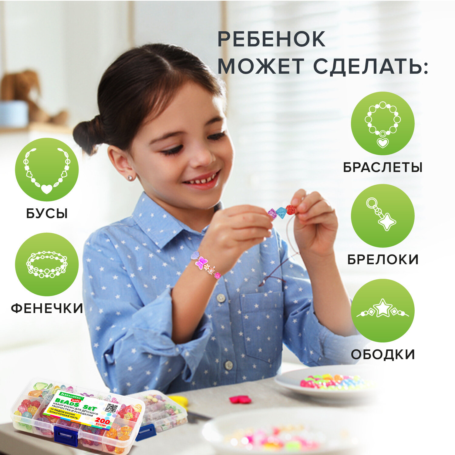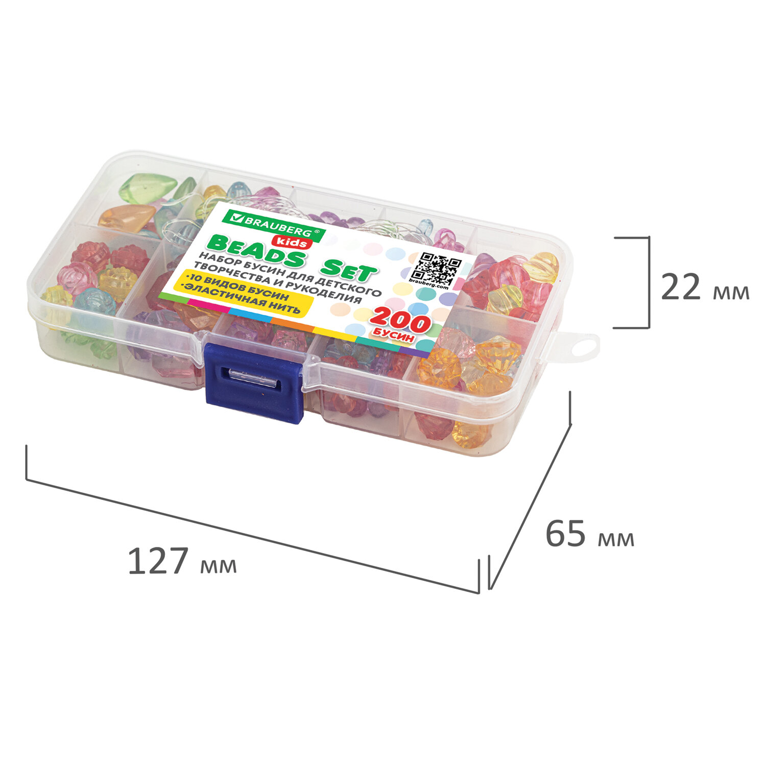 664694, Набор BEADS SET для творчества, рукоделия и создания украшений, 200 бусин, 10 видов, прозрачные, нить, BRAUBERG KIDS, 664694