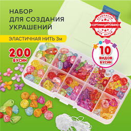 Описание товара 664694, Набор BEADS SET для творчества, рукоделия и создания украшений, 200 бусин, 10 видов, прозрачные, нить, BRAUBERG KIDS, 664694