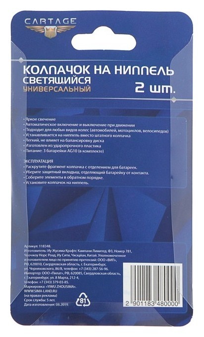 Светящийся колпачок на ниппель Cartage, набор 2 шт