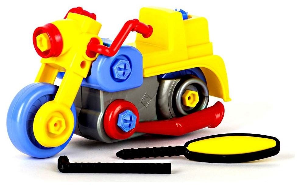 Конструктор "Мотоцикл" способен вызвать интерес у маленьких автолюбителей. Из множества деталей ребенку предлагается собрать миниатюрное транспортное средство - для этого нужно будет воспользоваться отверткой, которая в комплект не входит. Собранная игрушка обладает подвижными элементами - колеса мотоцикла способны вращаться, поэтому изделие вполне пригодно для замечательной игры.