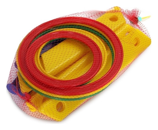В комплект "Кольцеброс" входит все необходимое для игры: шесть разноцветных колец двух размеров, конструкция-подставка и шесты-мишени.