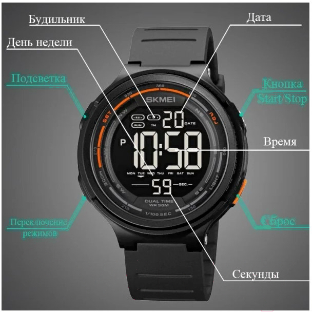 • Дополнительная индикация времени секунды, дата, день недели