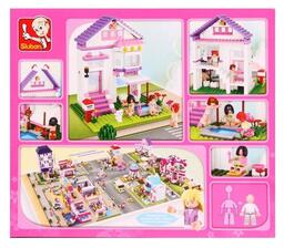 Игровой набор содержит 291 деталь и позволяет сконструировать роскошный двухэтажный коттедж с балкончиком и верандой, бассейн с лужайкой и 2 фигурки девочек-подружек.