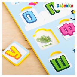 Перед малышом стоит задача: вытащить все вкладыши и установить ассоциативную связь между буквами и названиями съедобных предметов.