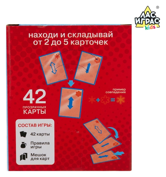 В наборе вы найдёте 42 прозрачные карточки. Задача игроков: разложить карты и искать среди них совпадения, не накладывая карты друг на друга.