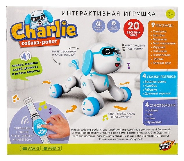 «Charlie» — чудо-робот, совсем как настоящий щенок! Берите его с собой на прогулку, играйте с ним дома или возьмите в поездку. Он будет петь весёлые песенки, рассказывать стихи и сказки, забавно говорить и лаять. С таким электронным питомцем малыш точно не заскучает.