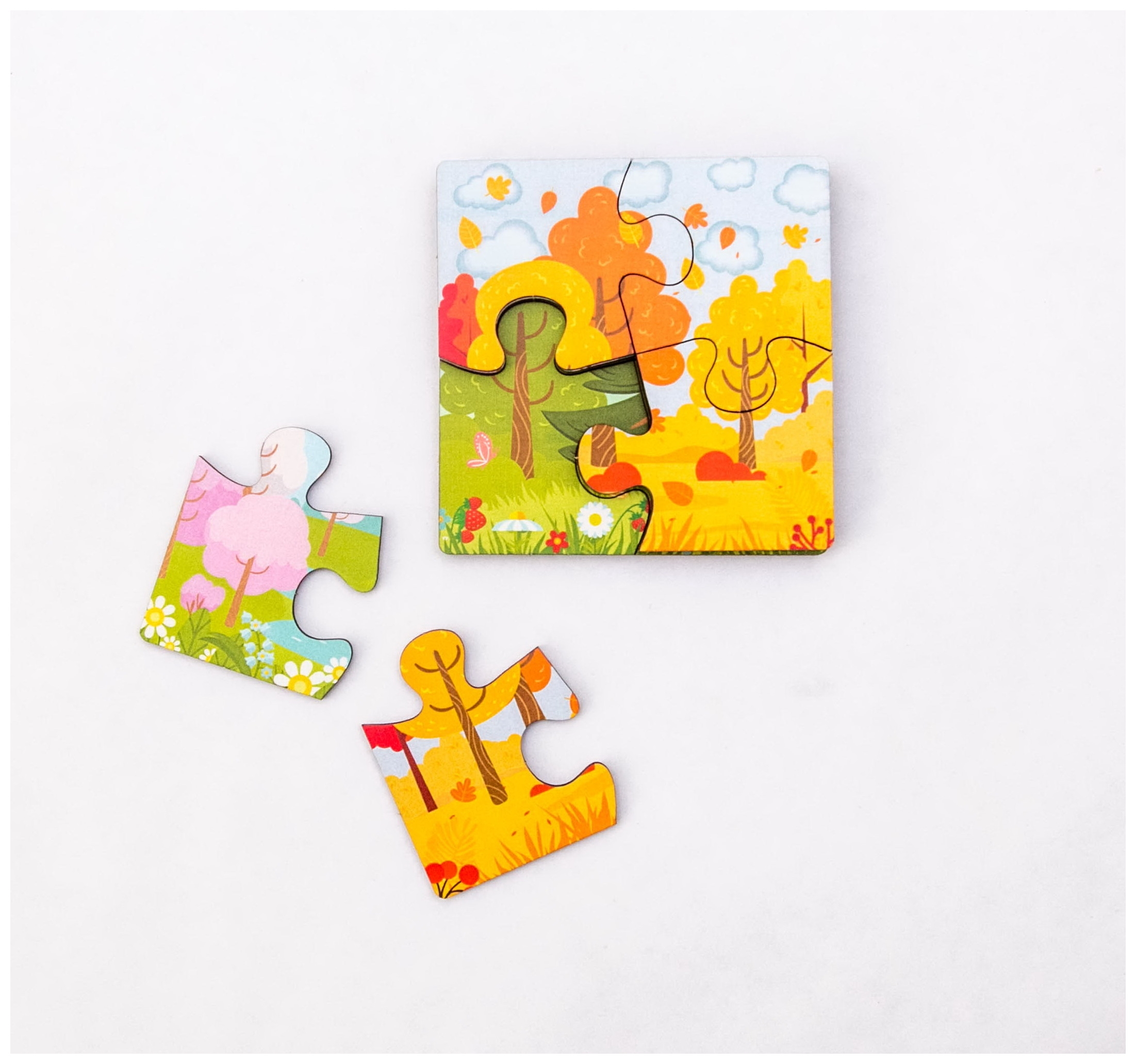 Пазл для малышей – это развивающая игрушка - головоломка, которая учит воспринимать связь между целой картинкой и ее частями для самых маленьких детей. Ваш малыш с удовольствием будет рассматривать яркие тематические изображения пазлов и пробовать соединять замысловатые детали между собой. Терпение и небольшая помощь взрослого очень быстро принесут свои плоды, ребенок научится собирать замечательные картинки, которые состоят из 4 деталей. В комплекте ребенок найдет сразу 4 варианта пазлов, что, несомненно, разнообразит его деятельность и поможет в развитии мелкой моторики, мышления, воображения, тактильного и зрительного восприятия.