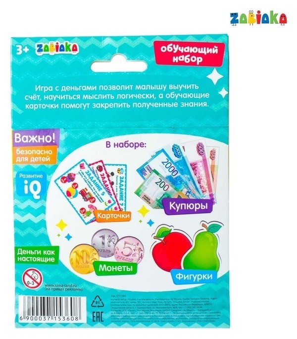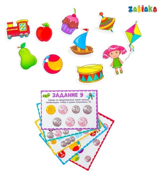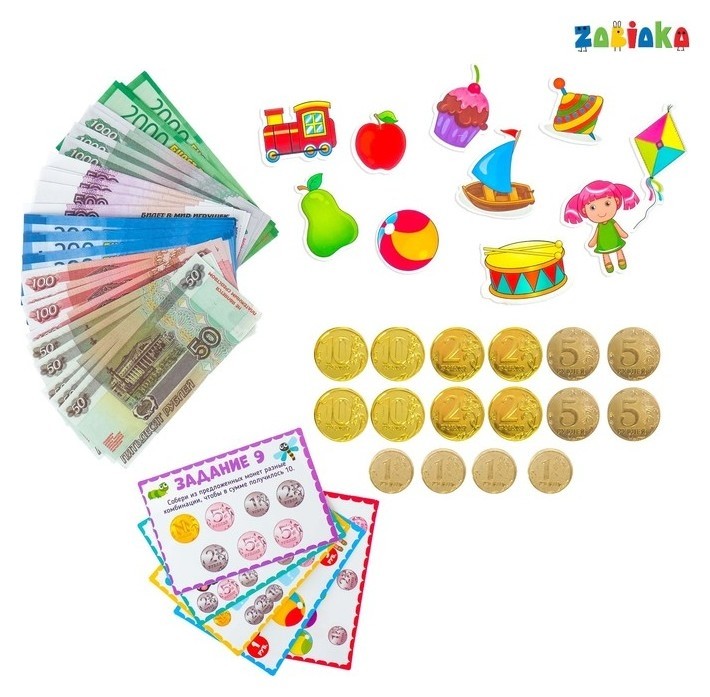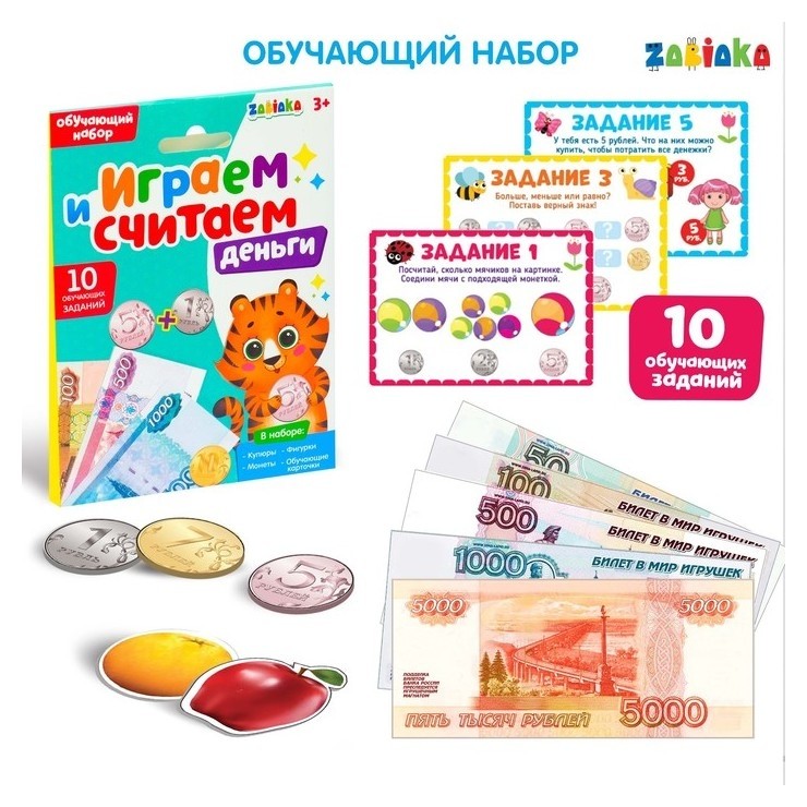 Обучающий набор с деньгами «Играем и считаем» поможет ребёнку научиться считать, а 10 заданий закрепят полученные знания.