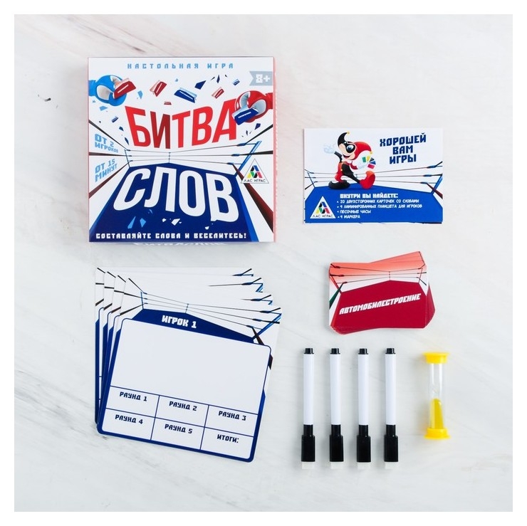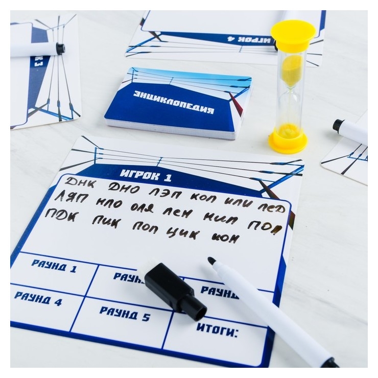 Игрок переворачивает карту со словом, и все участники выписывают его на свои планшеты.