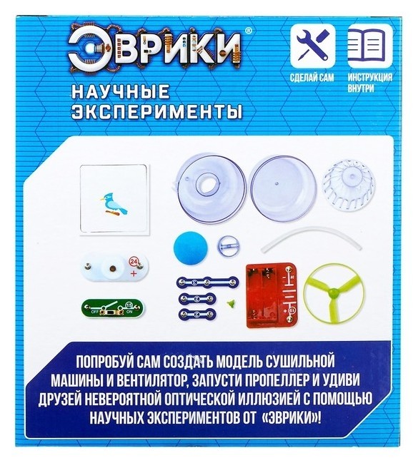 С помощью электронного конструктора ребёнок соберёт флуоресцентный вентилятор, тарелку, а также проведёт интересные эксперименты. В процессе юный изобретатель узнает, как работает сушильная машина и что такое инерция зрения.