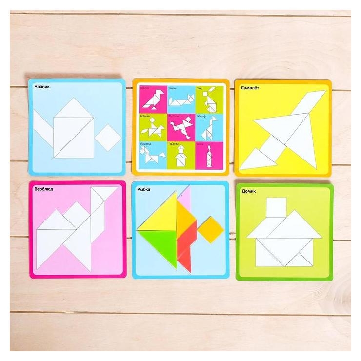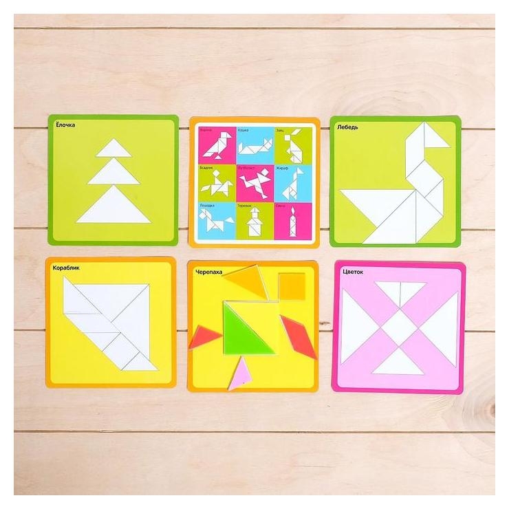 Головоломка Танграм: 5 карточек с 10 схемами, пластиковые детали, мозаика