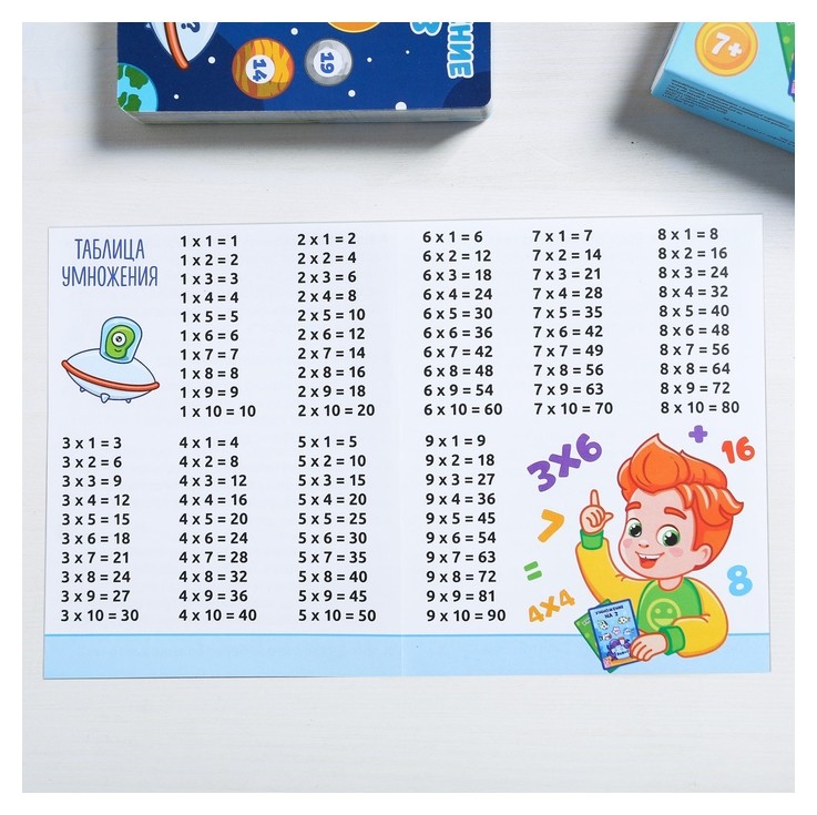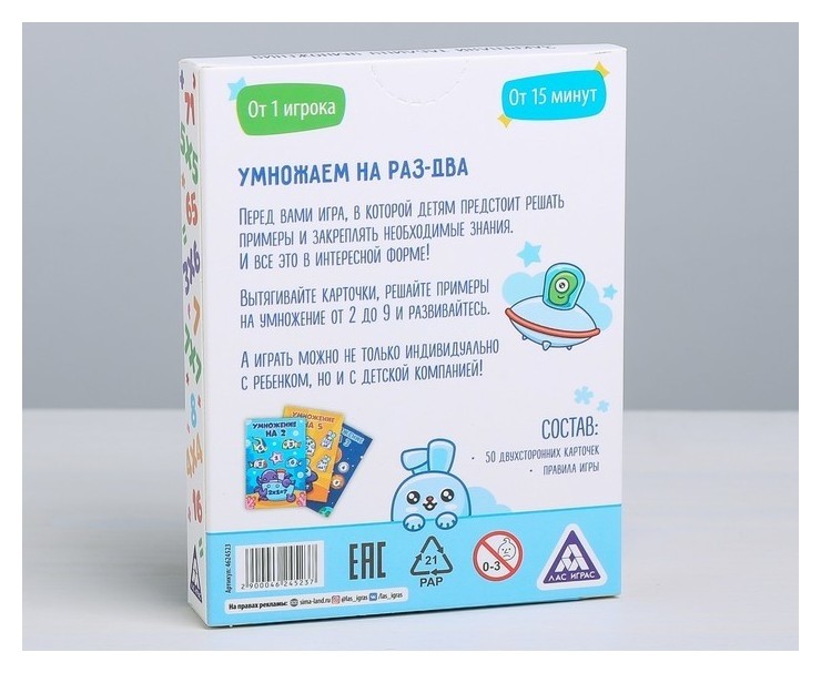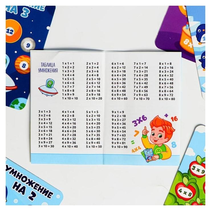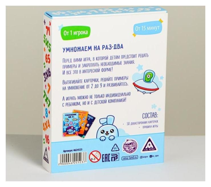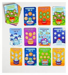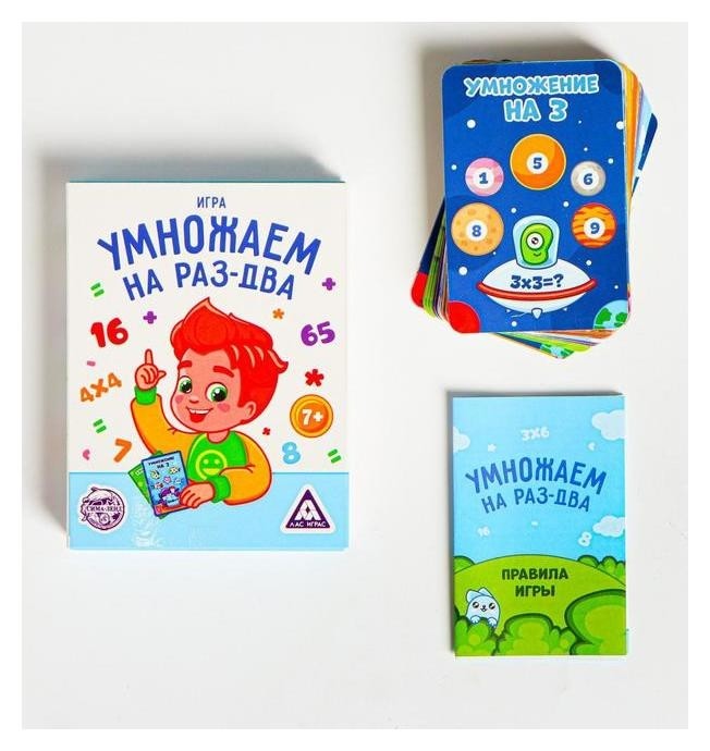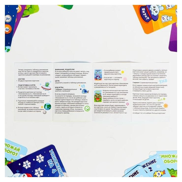 Разделите карточки на 5 колод. На каждой карточке (кроме колоды «Умножай наоборот») снизу находится пример, а выше рассыпано 5 чисел, одно из которых относится к данному примеру. Итак, положите карточку перед ребёнком и попросите его решить пример. Когда вы используете все карточки умножения (от 2 до 9), можно переходить к колоде «Умножай наоборот». Задача ребёнка в этом случае — подобрать число, которое подходит для данного примера. Вы можете перемешивать все карточки или решать примеры на время. Главное, чтобы ребёнку было интересно!