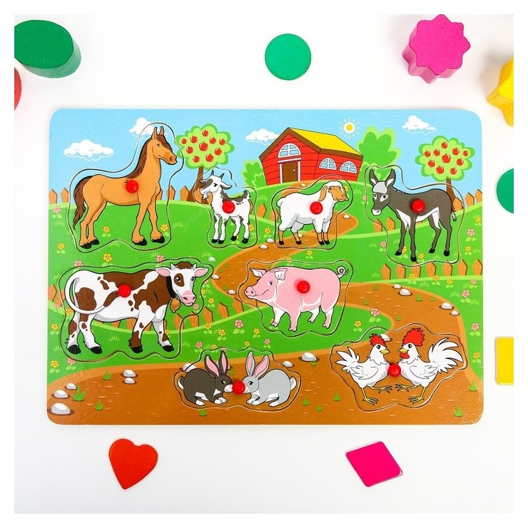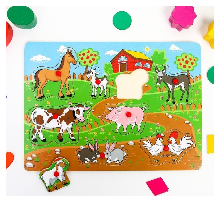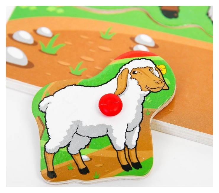 Разноцветная головоломка познакомит кроху с фермерским хозяйством. Помогите чаду найти для каждой детали подходящее место на основании. Вместе обсудите, какие животные и птицы обитают на ферме, и что там растёт.