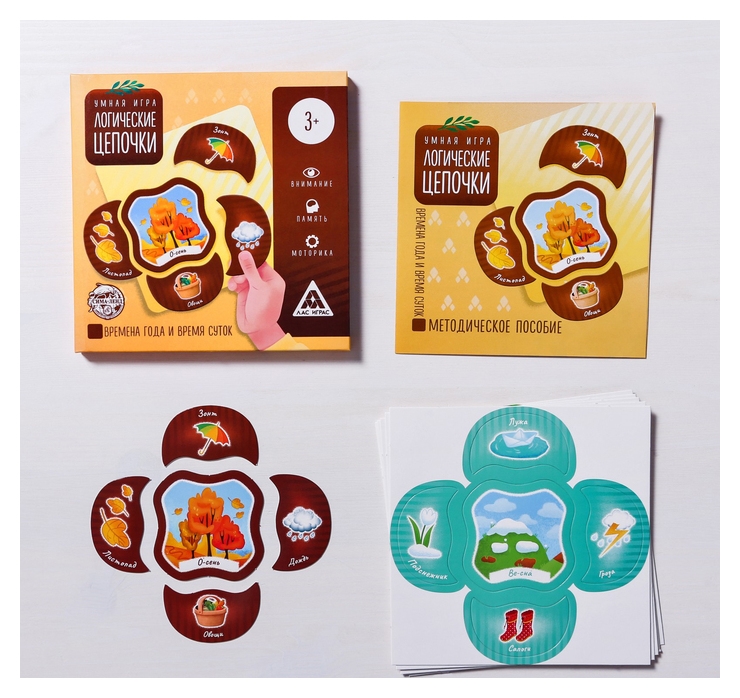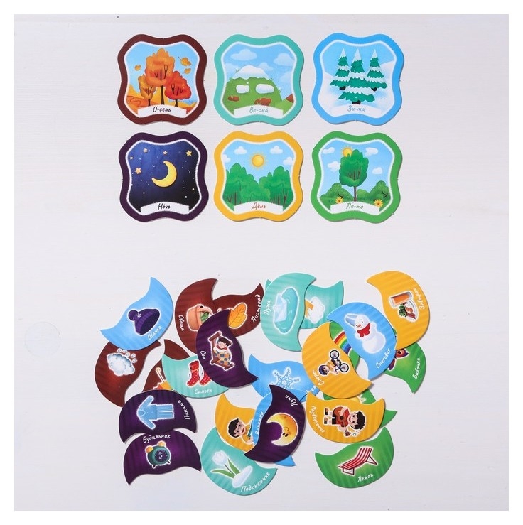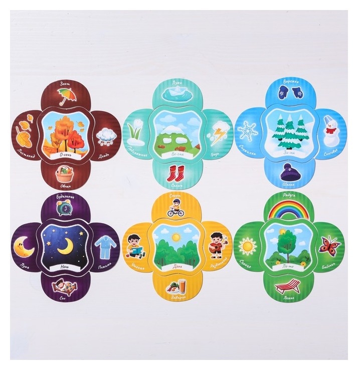 Его ждут 6 логических цепочек: 6 карточек с временами года и суток и 24 картинки. Их необходимо объединять по 4 штуки около нужной круглой карточки. Каждое время года и суток подписаны по слогам и с ударением, поэтому обязательно произносите вместе с крохой их названия.