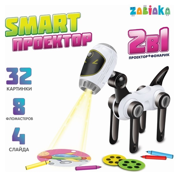 Проектор-лампа для рисования «Космическая собачка», 4 слайда, 32 картинки, 8 фломастеров