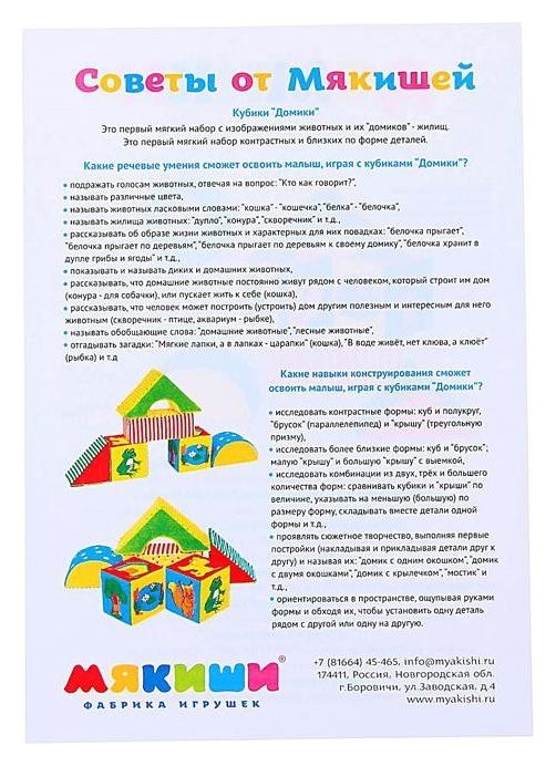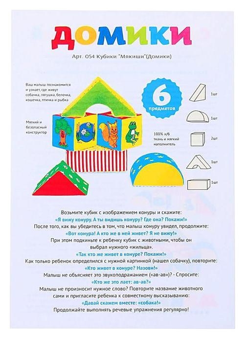 Занимательный набор кубиков увлечёт любого малыша, познакомит его с основами конструирования, некоторыми видами животных и образом их жизни. Мягкий конструктор «Домики» стимулирует познавательную активность крохи, способствует развитию логики, моторики и тактильного восприятия.