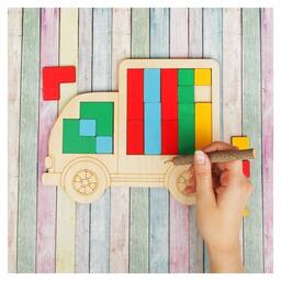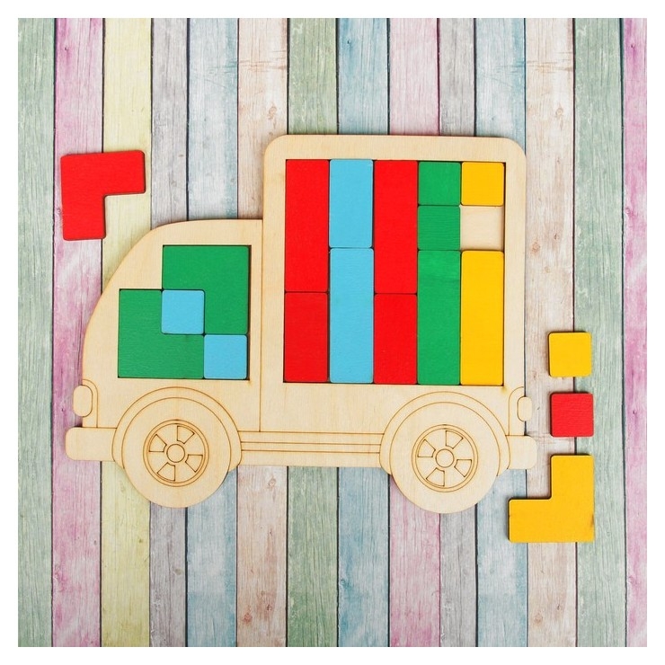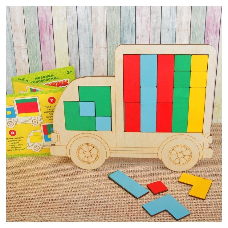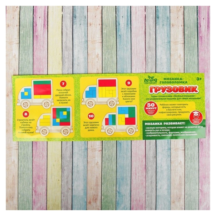 В данной мозаике ребёнку предлагается разложить элементы головоломки по схеме, чтобы получился определённый орнамент внутри деревянной основы-персонажа. В инструкции к набору представлено 10 вариантов рисунка, которые предстоит повторить малышу. Помимо указанных способов, он может создавать и свои изображения.