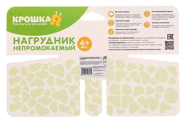 Непромокаемый нагрудник подходит для крошек, которые учатся кушать самостоятельно. Одежда останется сухой и чистой, а сам малыш сохранит опрятный и аккуратный вид после приёма пищи.