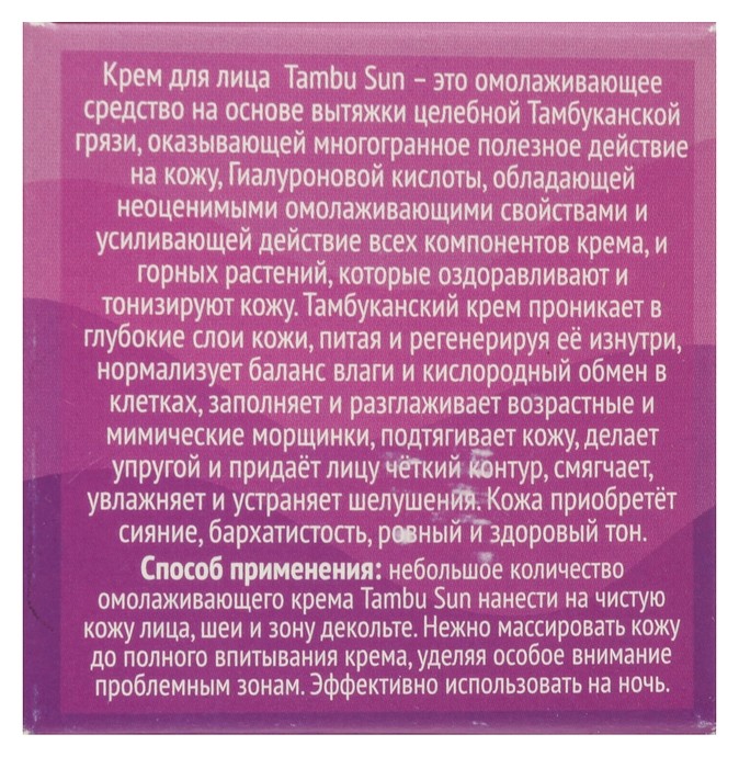 Крем для лица Tambu Sun — это средство на основе вытяжки из целебной тамбуканской грязи. В его состав входит гиалуроновая кислота, которая омолаживает кожу и усиливает действие всех компонентов средства.