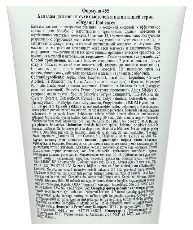 Бальзам для ног с экстрактом ромашки и молочной кислотой - эффективное средство для борьбы с натоптышами, трещинами, сухими мозолями и огрубевшими участками кожи стоп. Содержит 13,5 % мочевины, способствующей разрыхлению огрубевшей кожи и бережному удалению омертвевших клеток, не затрагивая здоровую кожу. Активный растительный комплекс с натуральными маслами и экстрактами возвращает коже стоп мягкость и эластичность.