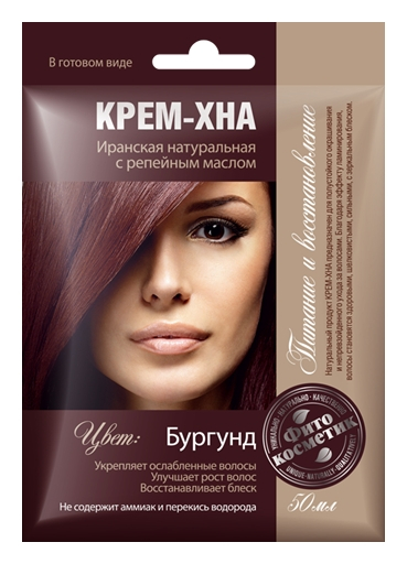 "Крем-хна" в готовом виде "Бургунд" - это инновационный прорыв в сфере окрашивания волос в удобной, готовой форме. Это натуральная природная краска, обогащенная репейным маслом, дарит волосам глубокий, сияющий цвет "Бургунд", интенсивно питает, увлажняет, восстанавливает и оздоровляет их, наполняет жизненной силой и энергией от корней до кончиков волос, придает ослепительный блеск и объем. Репейное масло усиливает капиллярное кровообращение в коже головы, питает и укрепляет корни волос. После использования "Крем-хны" в готовом виде, волосы приобретают насыщенный цвет, становясь более густыми, эластичными, упругими, шелковистыми и послушными. Инновационный продукт "Крем-хна" - это натуральная природная хна, для использования которой не требуется ни усилий, ни времени: достаточно нанести готовый состав на 15-30 минут, в зависимости от желаемой насыщенности цвета, и можно наслаждаться прекрасными результатами.