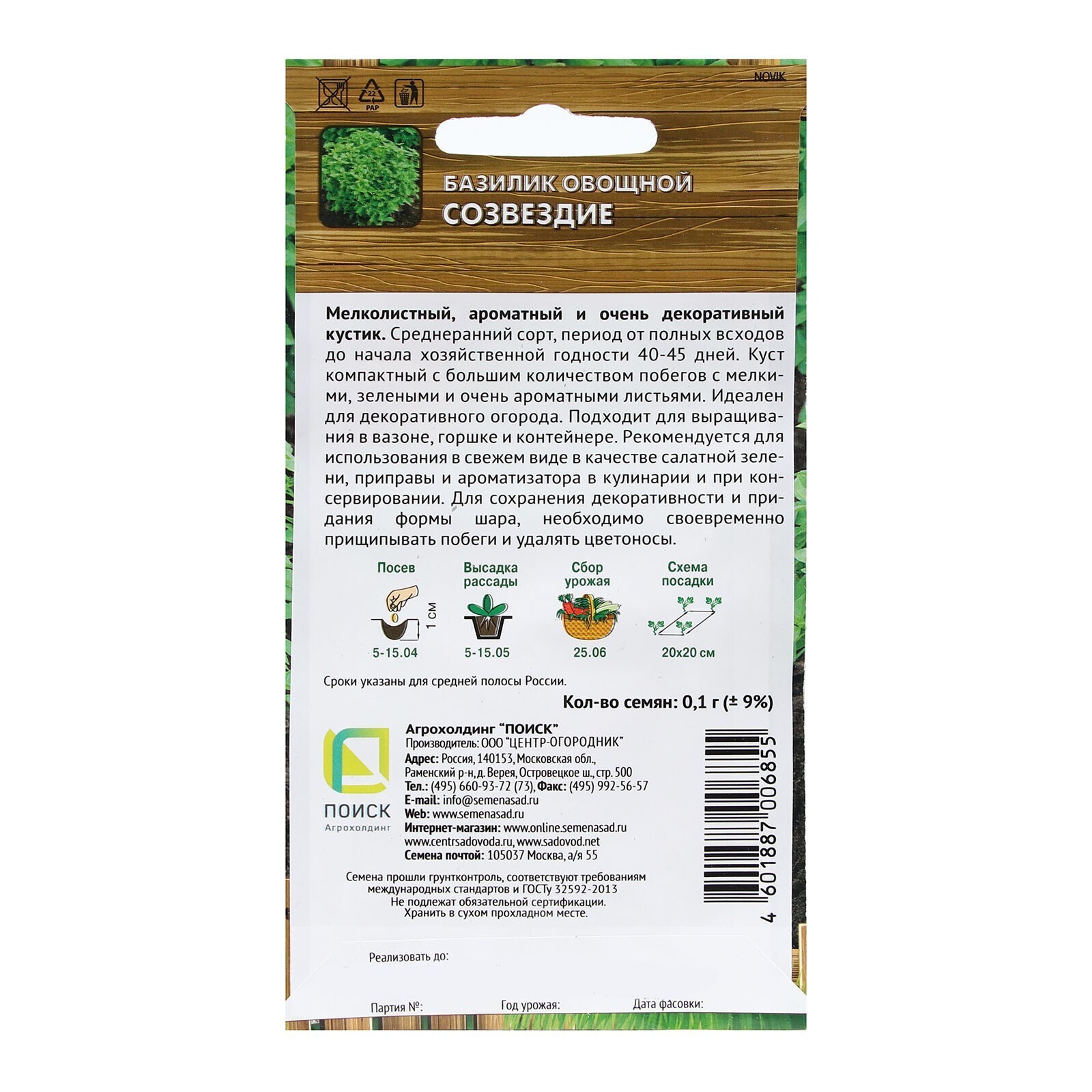 Базилик овощной мелколистный, ароматный и очень декоративный кустик. Среднеранний сорт, период от полных всходов до начала хозяйственной годности 40-45 дней. Куст компактный с большим количеством побегов с мелкими, зелеными и очень ароматными листьями. Идеален для декоративного огорода. Подходит для выращивания в вазоне, горшке и контейнере. Рекомендуется для использования в свежем виде в качестве салатной зелени, приправы и ароматизатора в кулинарии и при консервировании. Для сохранения декоративности и придания формы шара, необходимо своевременно прищипывать побеги и удалять цветоносы.