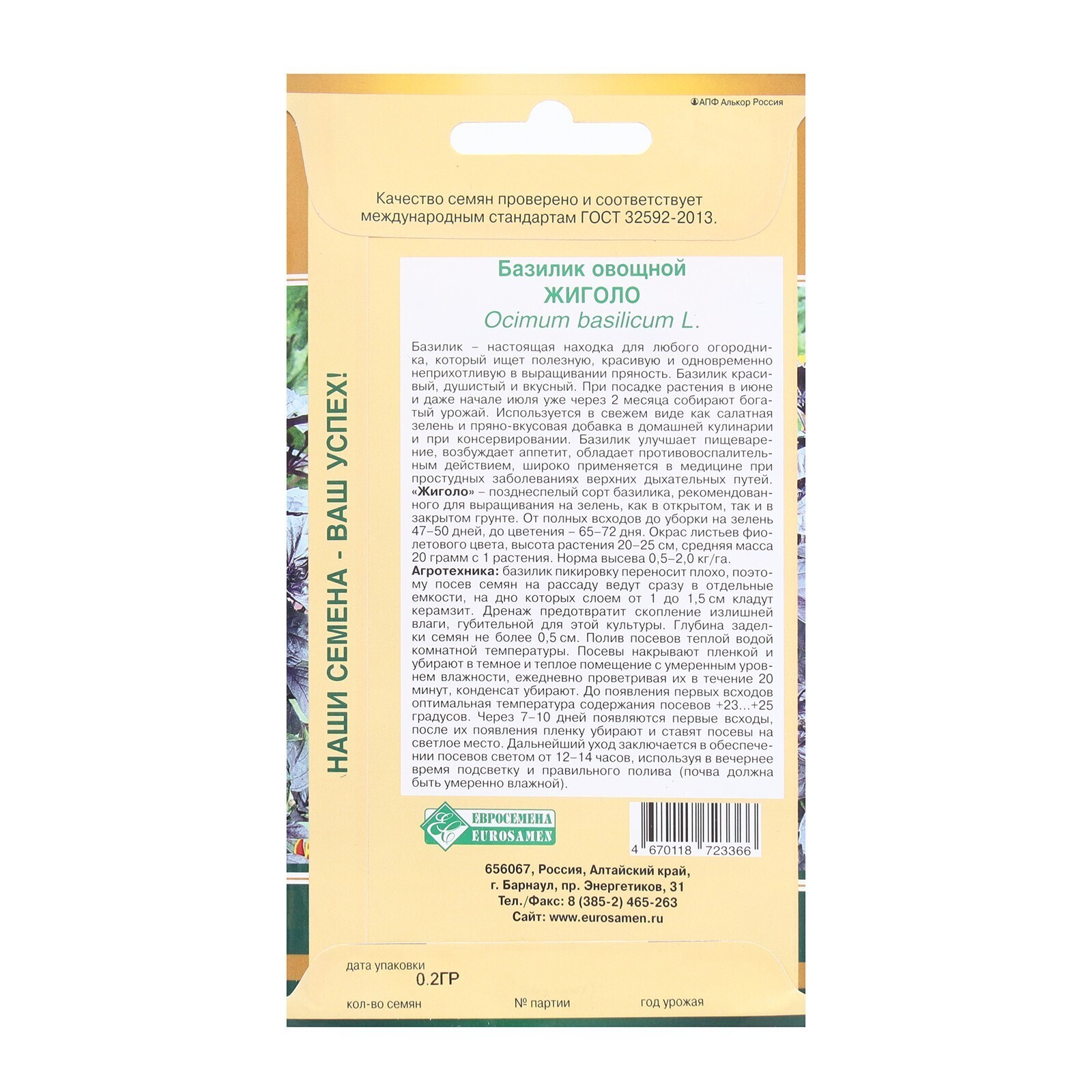 Семена Базилик овощной Жиголо, 0,2 г