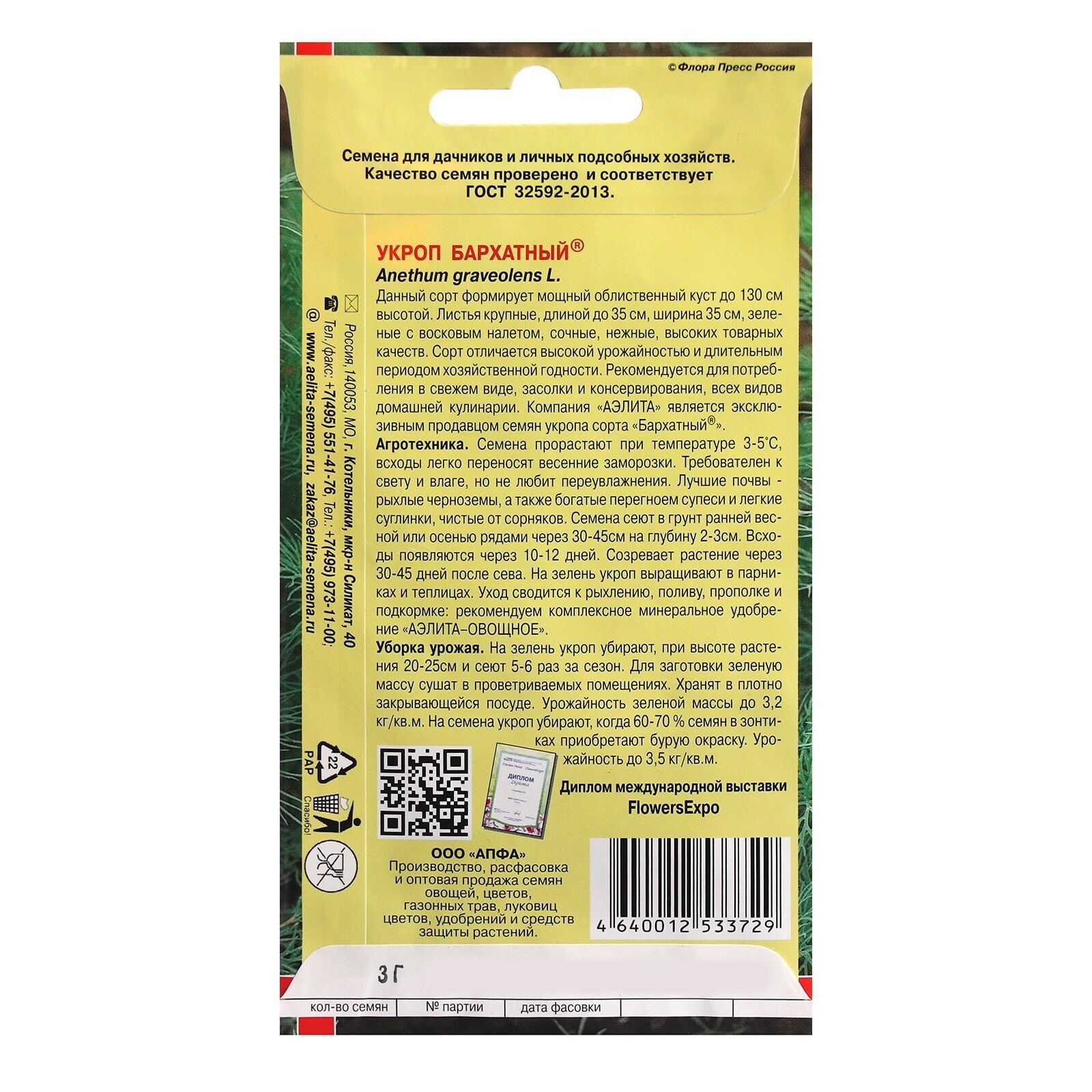 Центральный зонтик выпуклый, крупный с большим количеством лучей. Масса одного растения при уборке на зелень 24-35 г, на специи - 45-67 г. Аромат сильный. Урожайность на зелень 1,2-1,9 кг/кв.м, на специи - 3,4-4,0 кг/кв.м. Укроп предпочитает супесчаные, легкосуглинистые, хорошо окультуренные, нейтральные почвы. Посев в открытый грунт ранней весной или под зиму. Применяют многократные весенне-летние посевы с интервалом 10-12 дней, Глубина заделки семян 1-2 см.