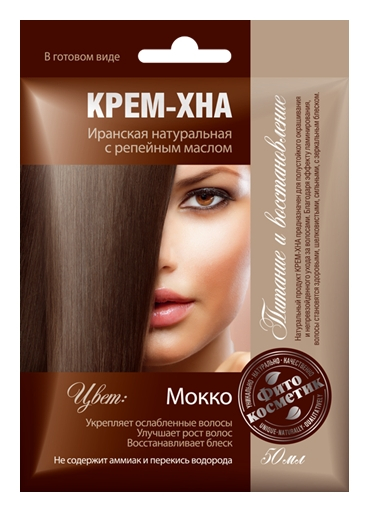 Крем-хна (цвет Мокко) – это современная натуральная краска для волос, придающая стойкий насыщенный и сияющий цвет. В отличие от обычных красок, в состав которых входит аммиак и перекись водорода,разрушающие структуру волос, наша Крем-хна имеет 100% натуральный состав и обогащена целебными маслами.Это превосходное средство для укрепления, уплотнения и улучшения роста волос. Средство сочетает две салонные процедуры дома – окрашивание волос и профессиональный уход. Для потребителей, которые не хотят окрашивать волосы, но хотят побаловать их непревзойденным уходом, мы разработали Бесцветную Укрепляющую крем-хну. Крем-хна в готовом виде очень удобна в применении, ее не нужно смешивать с водой, достаточно просто открыть пакетик и нанести уже готовый состав на волосы. Средство имеет нежную текстуру, ее легко наносить и смывать.