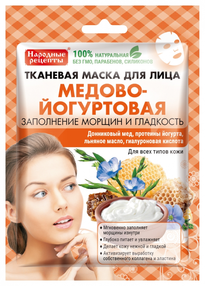 Современная натуральная тканева маска на основе донникового меда и протеинов йогурта мгновенно проникает в кожу, заполняет морщины изнутри, придает нежность и гладкость коже. Донниковый мед смягчает и тонизирует, дарит здоровый цвет лица, протеины йогурта придают гладкость, эластичность и упругость, гиалуроновая кислота обладает мощным увлажняющим эффектом, стимулирует выработку коллагена и эластина, льняное масло глубоко питает и восстанавливает, разглаживает морщинки.