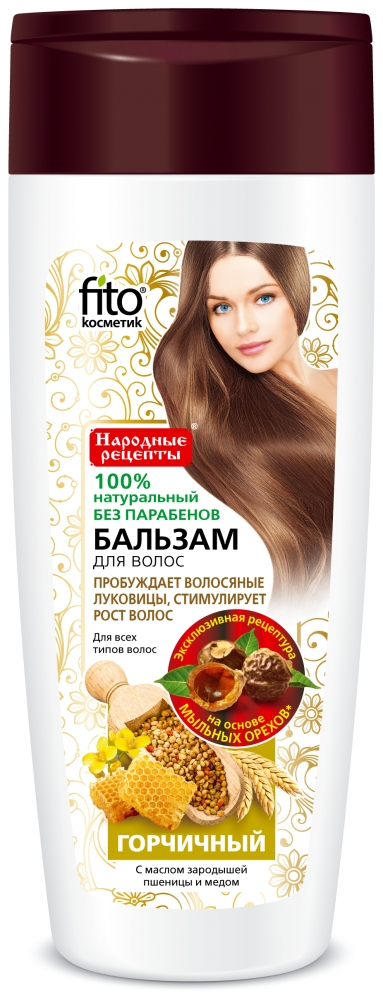 Горчица, масло зародышей пшеницы и натуральный мед – это самый эффективный народный рецепт для быстрого роста и густоты волос. Инновационная рецептура бальзама на основе экстракта мыльных орехов насыщает волосы витаминами и микроэлементами, придает им мягкость, шелковистость, здоровый и ухоженный вид, облегчает расчесывание и укладку. Горчица увеличивает приток крови к волосяным луковицам, укрепляет корни, стимулирует быстрый рост здоровых и сильных волос. Масло зародышей пшеницы глубоко питает волосы, устраняет их ломкость и сечение. Мед увлажняет волосы, придает им натуральный блеск.