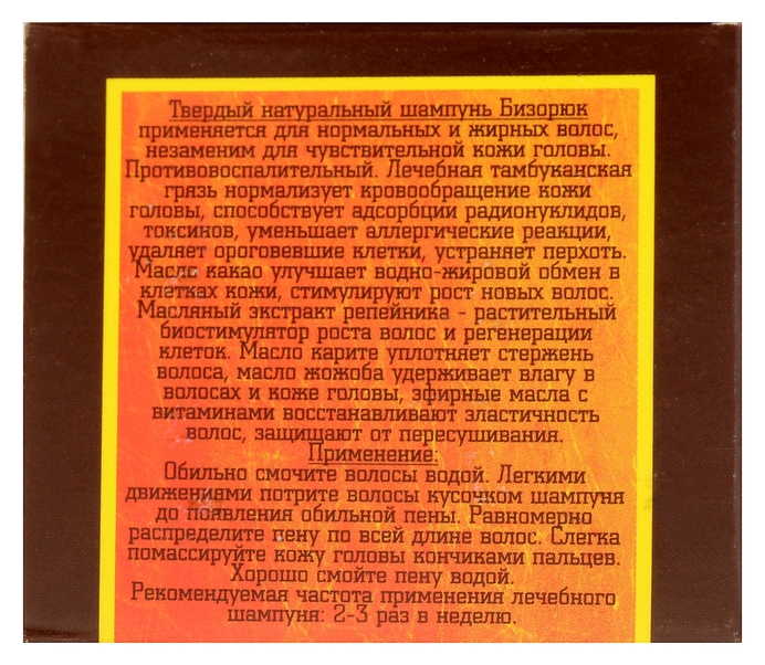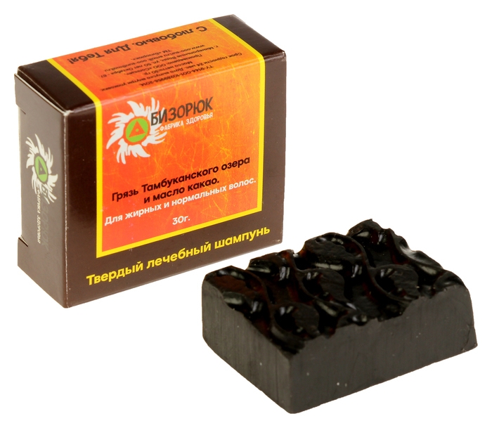 Твёрдый натуральный шампунь «Бизорюк» предназначен для жирных и нормальных волос. Средство обладает противовоспалительным действием. Тамбуканская грязь стимулирует кровообращение, способствует выведению из организма радионуклидов, токсинов, шлаков, удаляет ороговевшие клетки, устраняет перхоть.