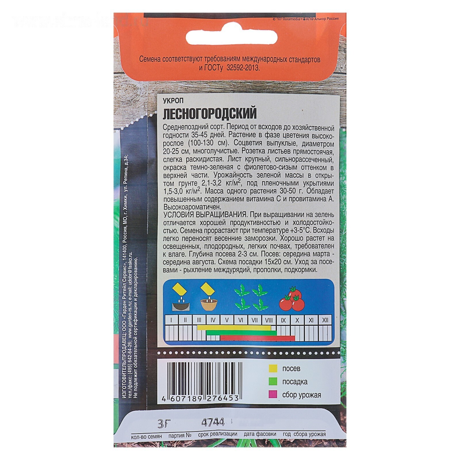 Высевают укроп данного сорта, начиная с ранней весны и заканчивая поздней осенью. Заблаговременно для его посадки подготавливаются грядки, для чего почва перекапывается в глубину на 25 см и удобряется органикой. Подобных приготовлений оказывается вполне достаточно, так как своевременный полив в сочетании с солнечным светом и питательной почвой способен обеспечить растения всем необходимым для плодотворного роста. Высевается укроп Лесногородский во влажную почву, что требуется для того, чтобы избежать полива после. Некоторые огородники склонны считать, что урожай укропа, посеянный осенью, оказывается намного лучше, чем тот, который посажен весной. Место для посева должно быть только солнечным, в противном случае укроп будет вытягиваться и побледнеет.