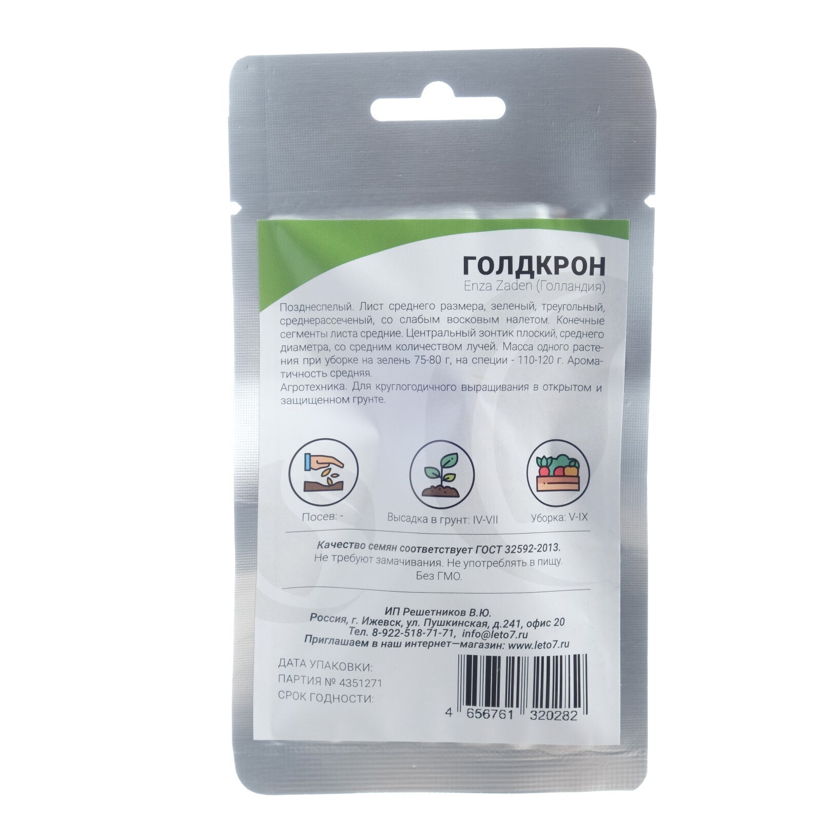 Позднеспелый. Лист среднего размера, зеленый, треугольный, среднерассеченый, со слабым восковым налетом. Конечные сегменты листа средние. Центральный зонтик плоский, среднего диаметра, со средним количеством лучей. Масса одного растения при уборке на зелень 75-80 г, на специи - 110-120 г. Ароматичность средняя.