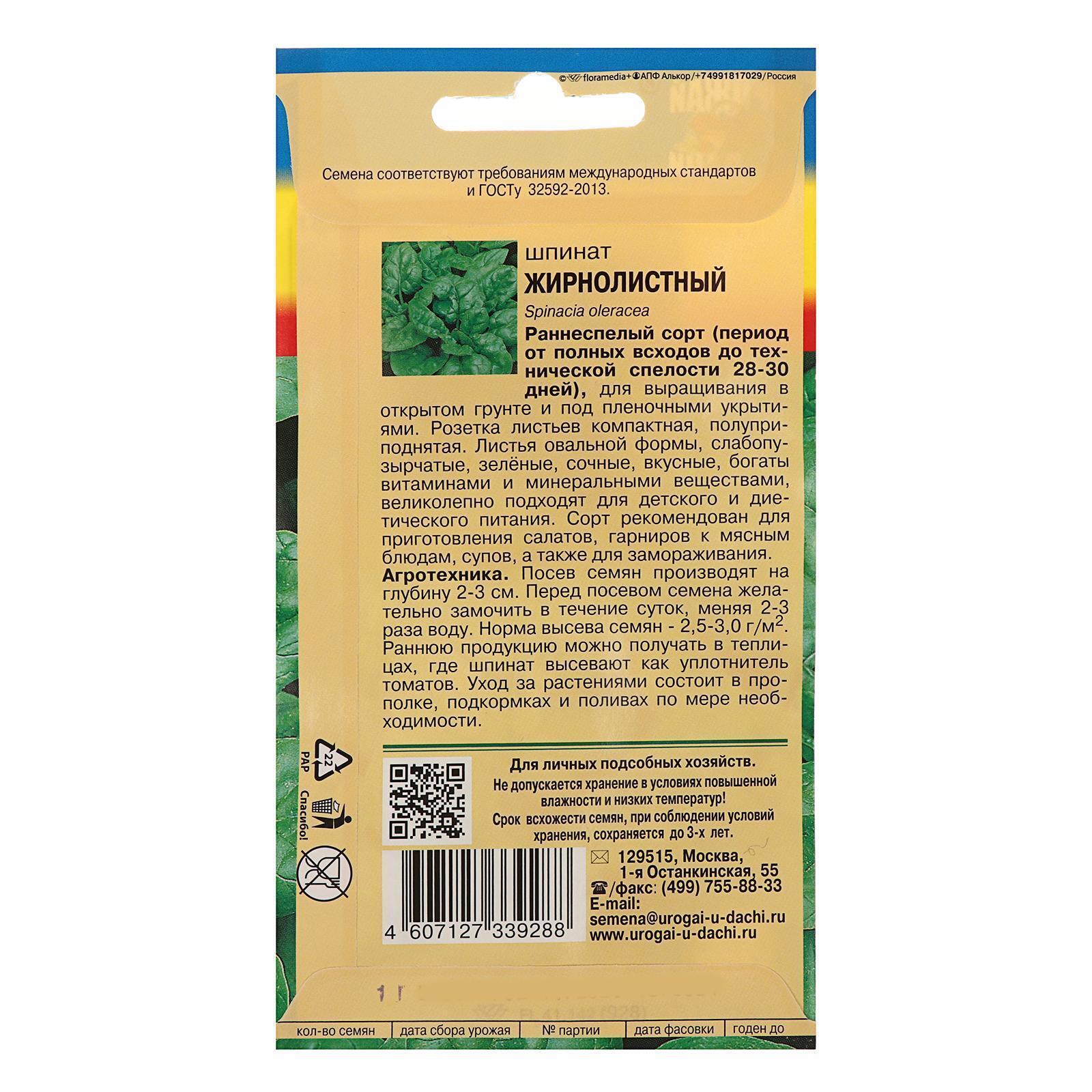 Посев семян производят на глубину 2-3 см. Перед посевом семена желательно замочить в течение суток, меняя 2-3 раза воду. Норма высева семян - 2,5-3,0 г/м2. Раннюю продукцию можно получать в теплицах, где шпинат высевают как уплотнитель томатов. Уход за растениями состоит в прополке, подкормках и поливах по мере необходимости.