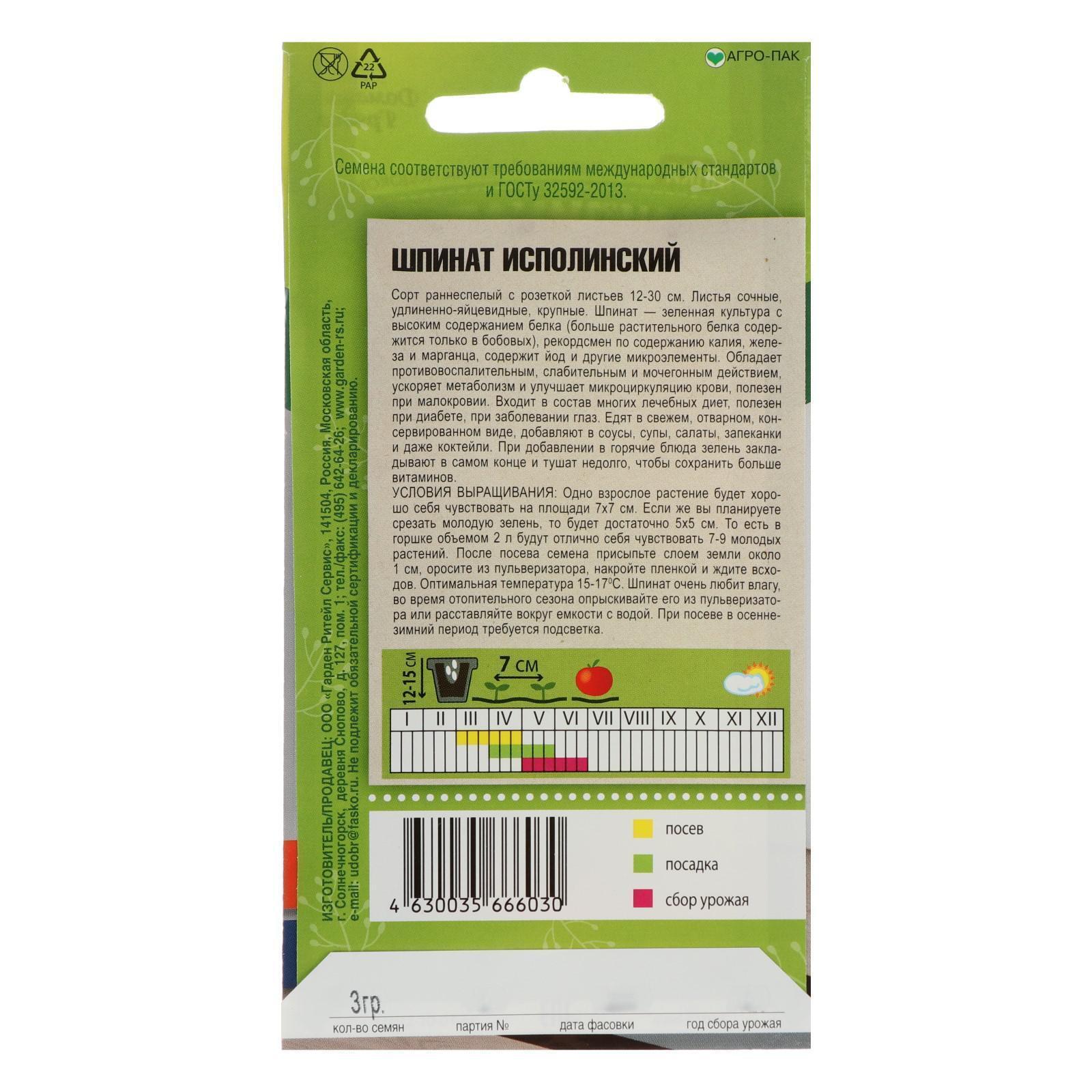 Раннеспелый (25-35 дней от полных всходов до уборки урожая) очень урожайный сорт. Розетка листьев диаметром 12-20 (до 50) см. Листья овальные, слабопузырчатые, сочные, нежные. Шпинат богат белками, солями железа, калия, каротином. В пищу используются молодые листья в свежем и переработанном виде. Сохраняет свои вкусовые качества при консервировании. Растение холодостойкое, отлично растет при температуре 15-18ºС. Сорт чувствителен к длине дня (при длинном дне стрелкуется). Урожайность до 2,8 кг/м2.