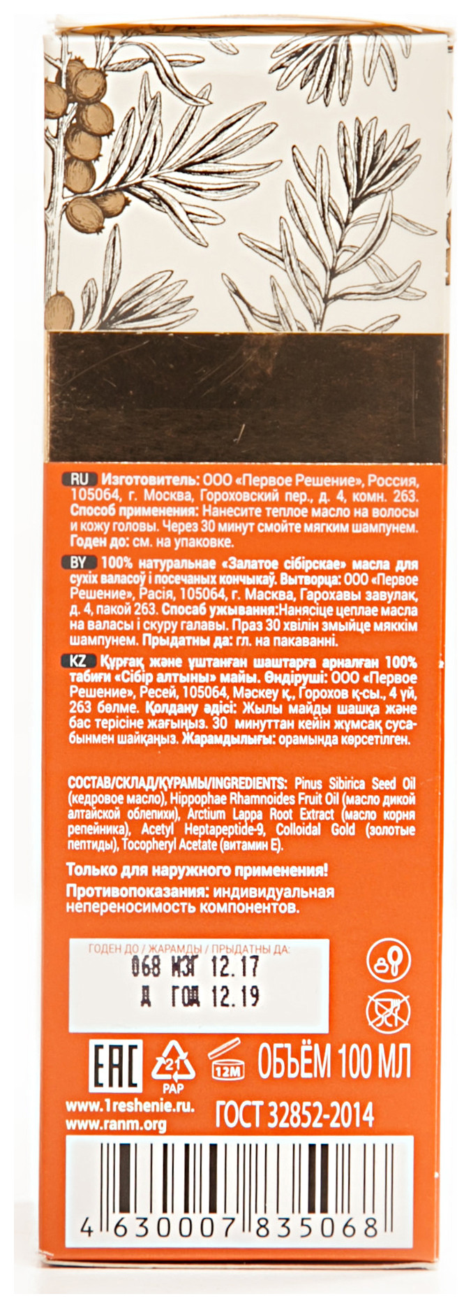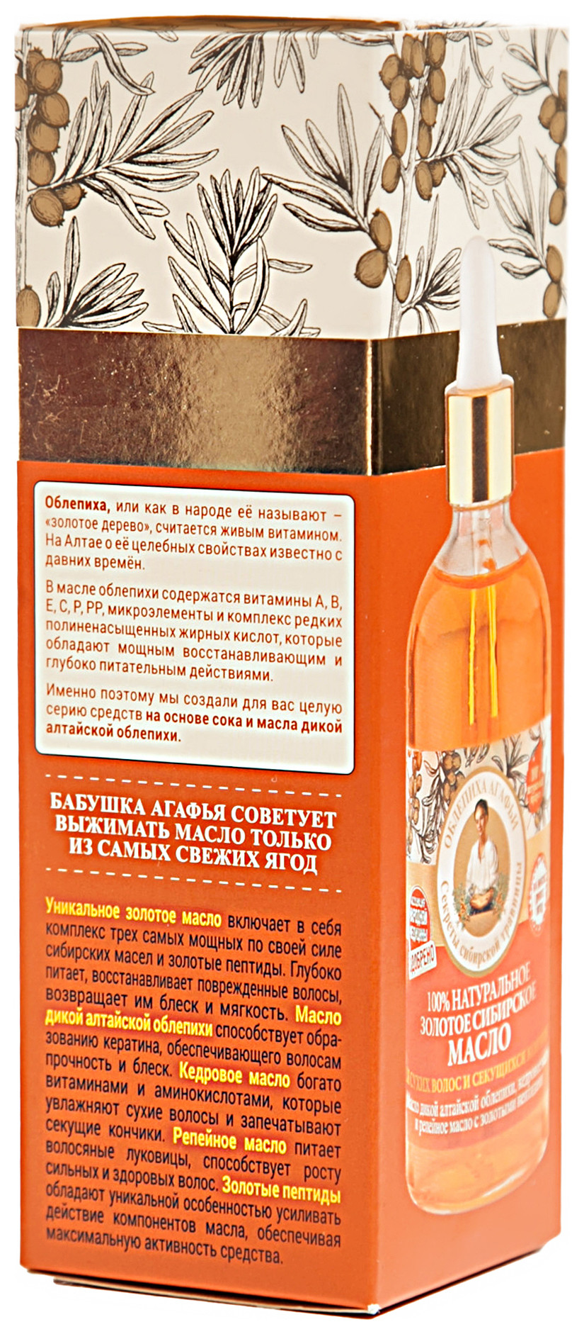 Уникальное золотое Масло включает в себя комплекс трех самых мощных по своей силе сибирских масел и ионы био золота. Глубоко питает, восстанавливает поврежденные волосы, возвращает им блеск и мягкость. Масло дикой алтайской облепихи способствует образованию кератина, обеспечивающего волосам прочность и блеск. Кедровое масло богато витаминами и аминокислотами, которые увлажняют сухие волосы и запечатывают секущие кончики. Репейное масло питает волосяные луковицы, способствует росту сильных и здоровых волос. Ионы био золота обладают уникальной особенностью усиливать действие активных компонентов масла, обеспечивая максимальную активность средства.