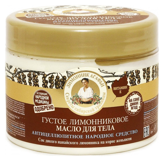Густое лимонниковое масло для тела создано по старинному народному рецепту и является эффективным средством в борьбе с целлюлитом. Натуральные природные компоненты стимулируют обменные процессы и значительно улучшают рельеф кожи. Сок дикого нанайского лимонника активизирует обмен веществ, что способствует глубокому расщеплению жировой ткани и заметному сокращению целлюлита. Корень женьшеняоказывает тонизирующее и омолаживающее действия, делает кожу упругой и подтянутой. Масло сибирского кедра насыщает кожу необходимыми питательными веществами, повышает её тонус и устраняет дряблость кожи.