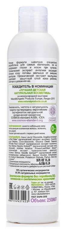 Содержит органические экстракты ангелики и мыльнянки. Мягкая формула шампуня специально разработана для самых маленьких , он не раздражает глазик и носик при купании. Органический экстракт ангелики защищает нежную кожу головы малыша от внешних факторов. Органический экстракт мыльнянки укрепляет защитный слой кожи ребенка, смягчая и увлажняя ее. 0% SLS, парабенов, силиконов или синтетических красителей.