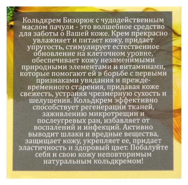 Кольдкрем «Секрет пачули» волшебное средство для заботливого ухода за Вашей кожей. Крем прекрасно увлажняет и питает кожу, придает упругость, стимулирует естественное обновление на клеточном уровне, обеспечивает кожу незаменимыми природными элементами и витаминами, которые помогают ей в борьбе с первыми признаками увядания и преждевременного старения, придавая коже свежесть, устраняя чрезмерную сухость и шелушения.