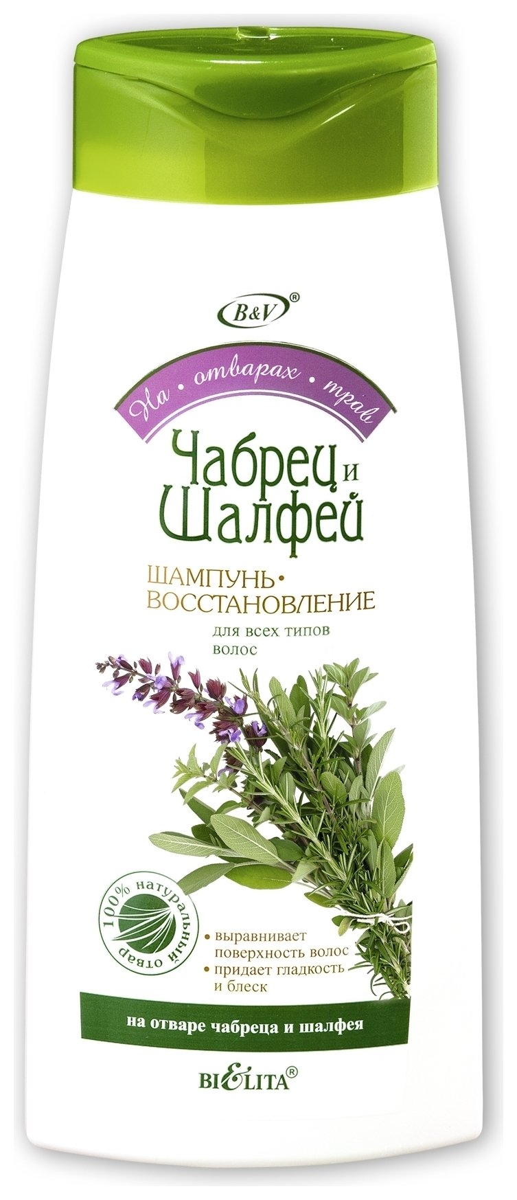 Шампунь-восстановление содержит полезный комплекс отвара чабреца и шалфея, который эффективно восстанавливает структуру волос, делая их гладкими, блестящими и шелковистыми.