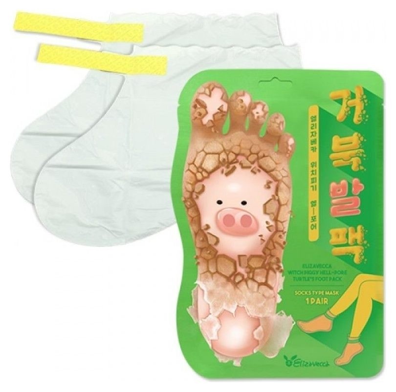 Маска-носочки для ног Elizavecca Witch Piggy Hell Pore Turtle's Foot Pack обладает такими свойствами, как очищение от различных загрязнений, восстановление поврежденных кожных участков, пилинг, интенсивное увлажнение и смягчение, питание кожи полезными компонентами. Изделие изнутри пропитано специальной эмульсией, в состав которой входит масло авокадо, улиточный муцин, комплекс экстрактов растительного происхождения и коллаген. Их взаимодействие позволяет ощутить на себе великолепный эффект. Масла авокадо и ши смягчают, питают, увлажняют, выполняют регенерацию клеток, значительно увеличивают упругость и эластичность. Они способны защитить кожу от негативного воздействия окружающих факторов, подарить ей шелковистость и гладкость. Улиточная слизь восстанавливает, отшелушивает омертвевшие клетки и ткани, омолаживает и оздоравлиавет. Продукт предоставляет антимикробный и антивирусный эффект, удерживает влагу внутри, улучшает клеточный обмен, ускоряет заживление рубцов, шрамов и мелких ранок.