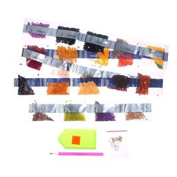 Разложите кристаллики с помощью карандаша по указанной схеме, заполнив всё полотно. На картине уже обозначены необходимые оттенки. Холст с клеевым покрытием будет надёжно удерживать стразы.