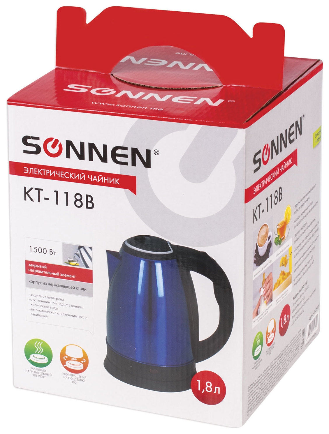 Чайник SONNEN KT-118B, 1,8 л, 1500 Вт, закрытый нагревательный элемент, нержавеющая сталь, синий